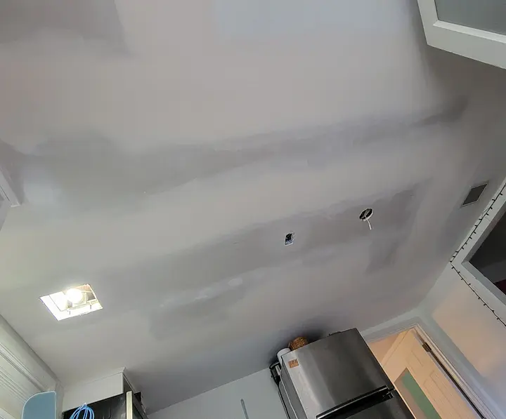 Smooth drywall installation and ceiling repairs, ready for paint.